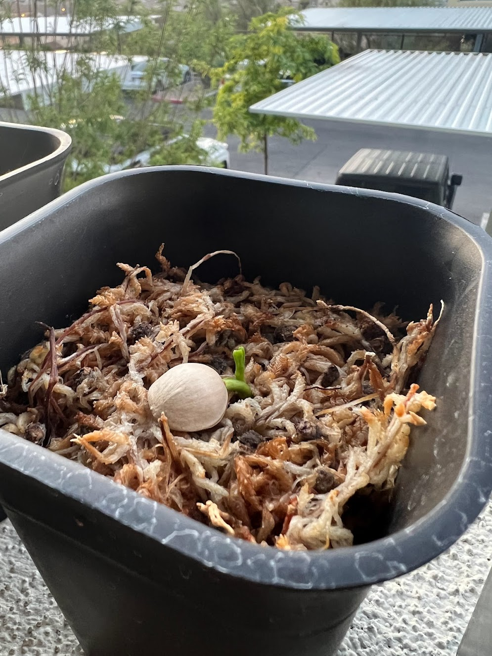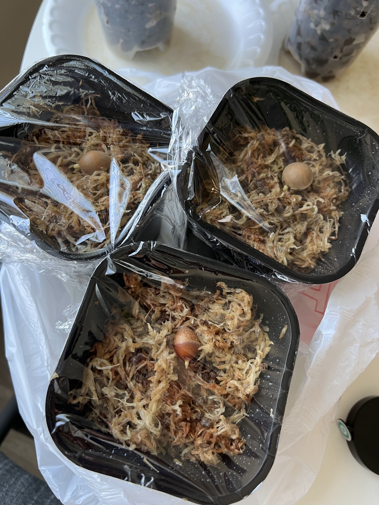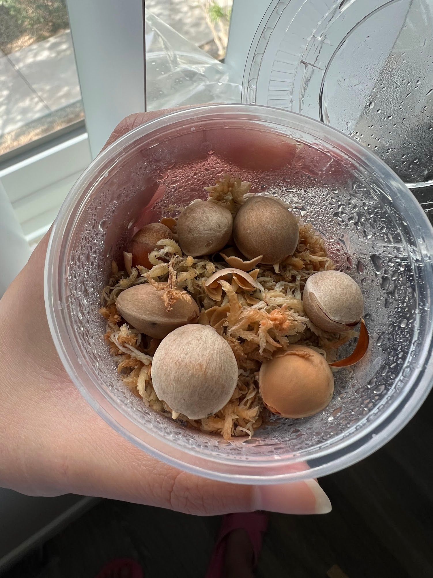 The instructions were easy. I just had to scar the seeds so that I could expose the flesh under the shell. Then I soaked it in water overnight, making sure the nuts sank to the bottom. This meant that the water entered the shell and soaks into the seed. The moist environment signals the plant it's the season to grow. To maintain that, the next day I drained the water and placed the seeds on a bed of moist sphagnum moss and waited for it to sprout.